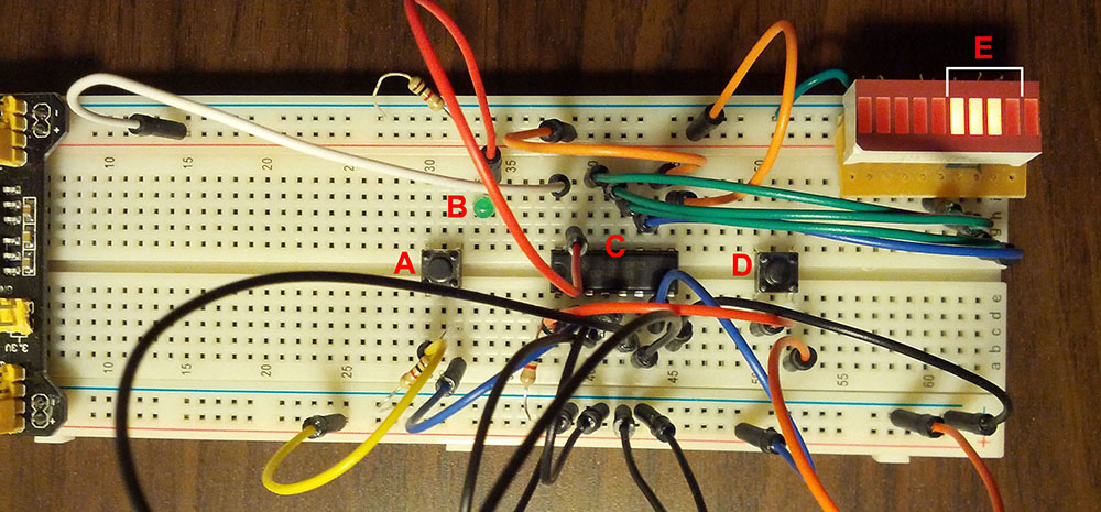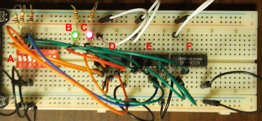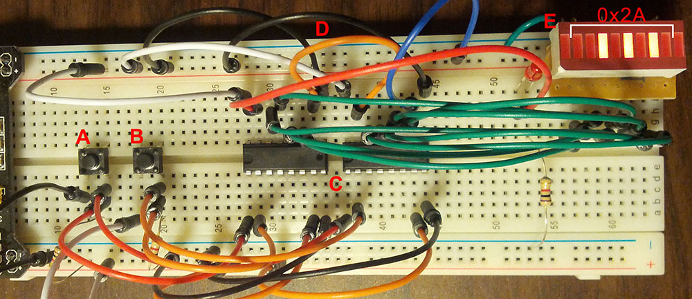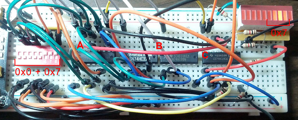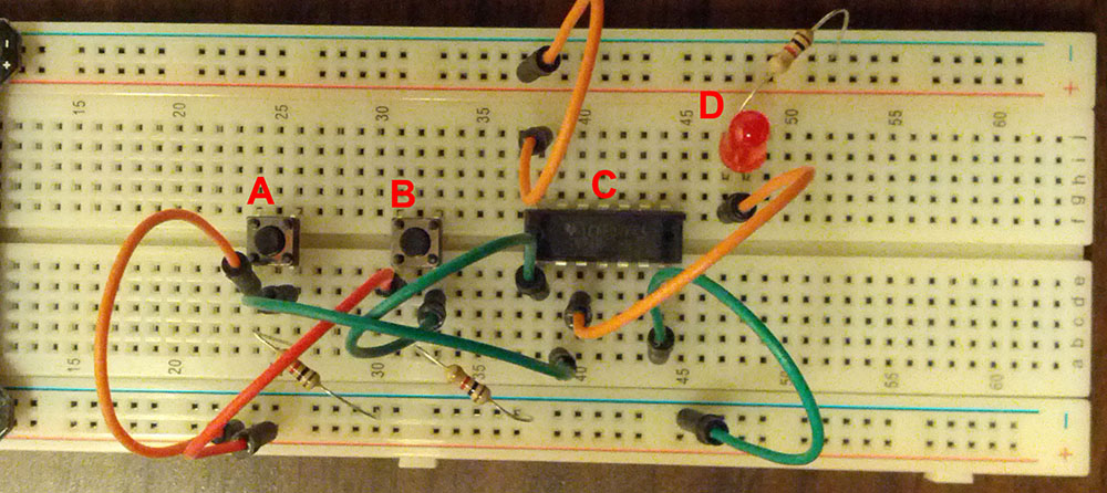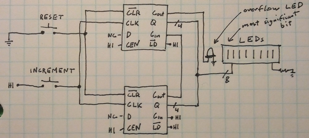 HIGH if at least two of the inputs are HIGH.This is just a simple circuit to exercise the functionality of a 74HC161 4-bit counter. A major flaw of this circuit is that the "increment" button, A, is not de-bounced, so the counter will often increment more than once when the button is pressed. I had no capacitors when I assembled this circuit, so I couldn't fix this.