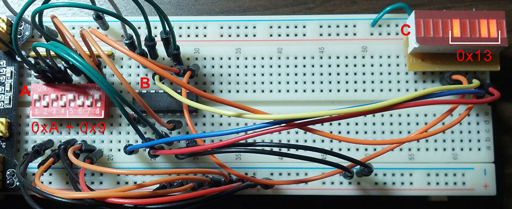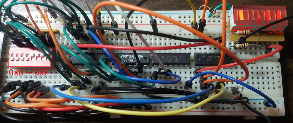 In this photo, 0 + 15 = 15 is calculated. (This isn't valid input to a BCD adder, but the result in this case is no different than adding 8 + 7.) Since the sum is greater than 9, the BCD overflow detector kicks in, enabling carry-out and adjusting the sum to properly wrap around from nine to zero.