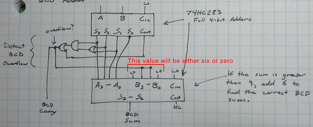 This circuit adds together two 4-bit BCD digits, producing a BCD sum and a carry bit. It works as follows: