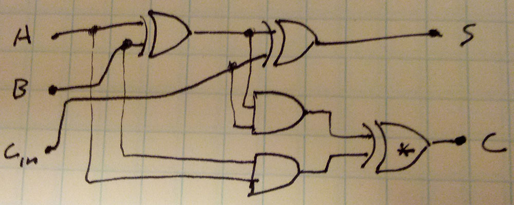 This is a schematic of a full adder, copied shamelessly from the internet. (The gate marked with an asterisk can be either an OR or an XOR gate, with no effect on behavior.)